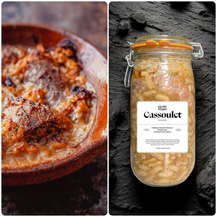 Haricots lingots, eau, saucisses de Toulouse et saucisses de couennes de la Maison Garcia*, poitrine, museau et oreille de porc, carottes, oignons, céleris, ail, tomate concentrée, sel, poivre, thym, laurier, romarin, épices.